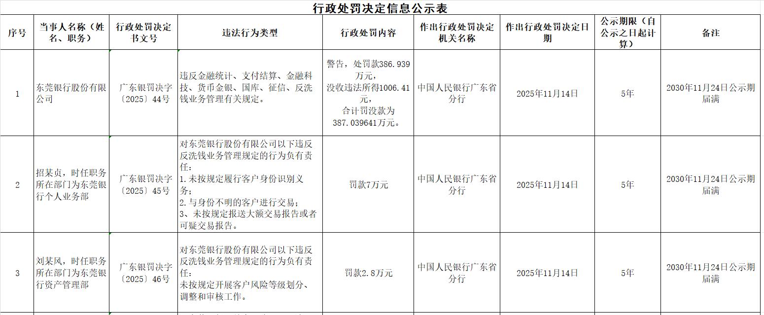 廣東銀罰決字〔2025〕44號顯示,東莞銀行股份有限公司違反金融統(tǒng)計、支付結(jié)算、金融科技、貨幣金銀、國庫、征信、反洗錢業(yè)務(wù)管理有關(guān)規(guī)定。中國人民銀行廣東省分行對其警告,處罰款386.939萬元,沒收違法所得1006.41元,合計罰沒款為387.039641萬元。