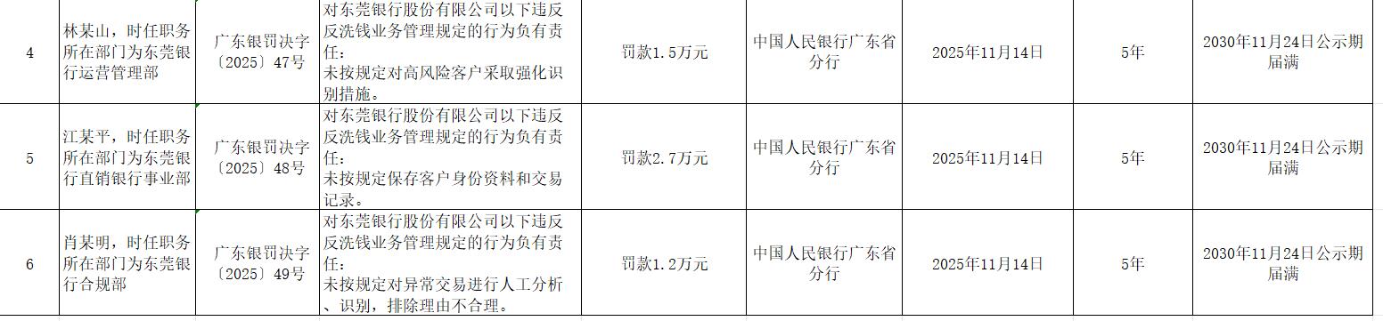廣東銀罰決字〔2025〕49號顯示,肖某明(時任職務(wù)所在部門為東莞銀行合規(guī)部)被罰款1.2萬元。