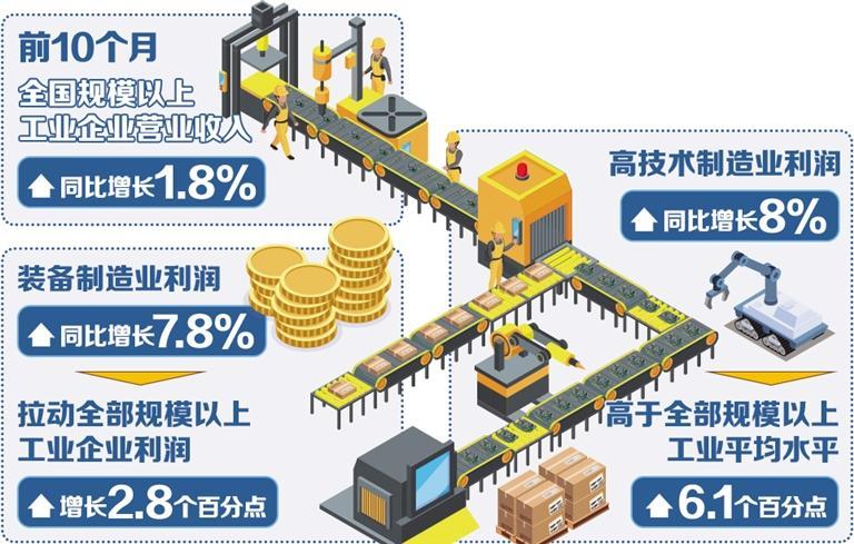 高技術(shù)制造業(yè)效益增勢(shì)良好。前10個(gè)月,規(guī)模以上高技術(shù)制造業(yè)利潤(rùn)同比增長(zhǎng)8%,高于全部規(guī)模以上工業(yè)平均水平6.1個(gè)百分點(diǎn)。從行業(yè)看,智能電子制造發(fā)展向好,智能無人飛行器制造、智能車載設(shè)備制造行業(yè)利潤(rùn)分別增長(zhǎng)116.1%、114.9%;半導(dǎo)體制造效益增長(zhǎng)較快,集成電路制造、電子專用材料制造、半導(dǎo)體分立器件制造行業(yè)利潤(rùn)分別增長(zhǎng)89.2%、86%、17.4%;精密儀器制造高質(zhì)量發(fā)展效果顯現(xiàn),光學(xué)儀器制造、專用儀器儀表制造行業(yè)利潤(rùn)分別增長(zhǎng)38.2%、14.1%。