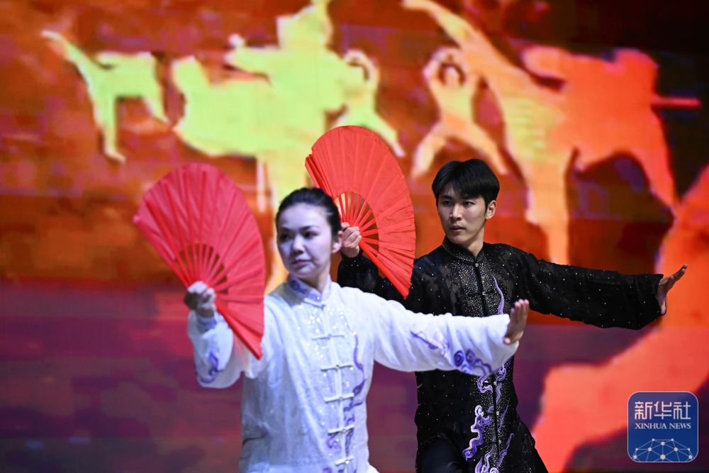 2月24日,在哈薩克斯坦阿拉木圖,演員在“絲路同源·命運(yùn)與共”文藝匯演上表演武術(shù)。