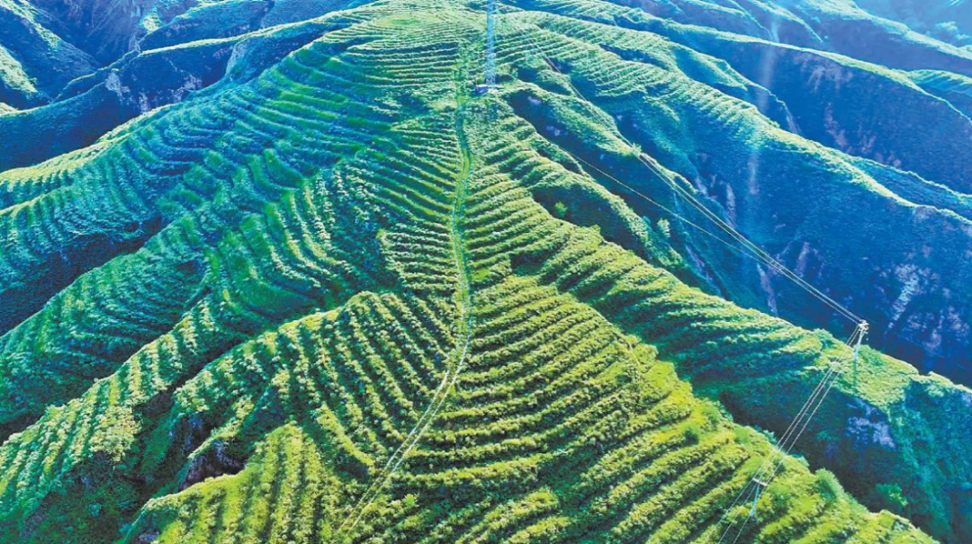 府谷縣田家寨生態(tài)修復(fù)后的山地梯田植被繁茂,綠意連片(資料照片)。