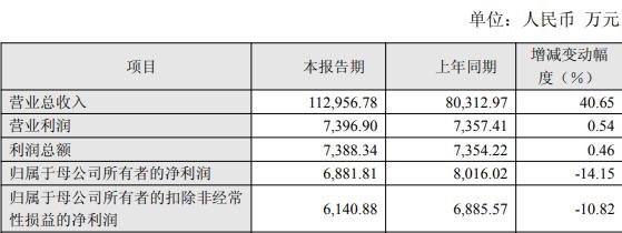 據(jù)公司2025年度業(yè)績快報公告,報告期內(nèi),公司實現(xiàn)營業(yè)總收入112,956.78萬元,同比增長40.65%;歸屬于母公司所有者的凈利潤6,881.81萬元,同比下降14.15%;歸屬于母公司所有者的扣除非經(jīng)常性損益的凈利潤6,140.88萬元,同比下降10.82%。