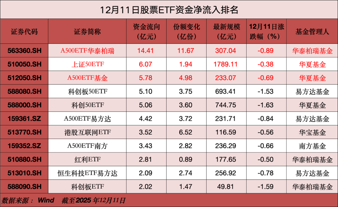 當日多數寬基ETF獲資金青睞,中證A500ETF、科創(chuàng)板50ETF、上證50ETF均獲大舉加倉,而行業(yè)主題ETF凈流出居前。從年底投資配置來看,機構普遍認為可關注核心寬基指數,在市場波動中實現穩(wěn)健配置與靈活應對。