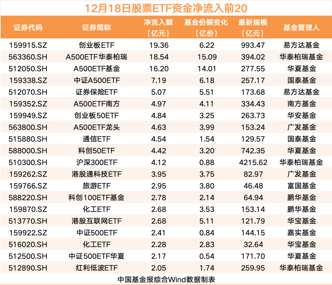 具體來看,12月18日共有37只ETF資金凈流入超1億元。其中,易方達基金的創(chuàng)業(yè)板ETF、A500ETF華泰柏瑞、華夏基金的A500ETF基金位列前三,資金凈流入分別為19.36億元、18.54億元、16.2億元。