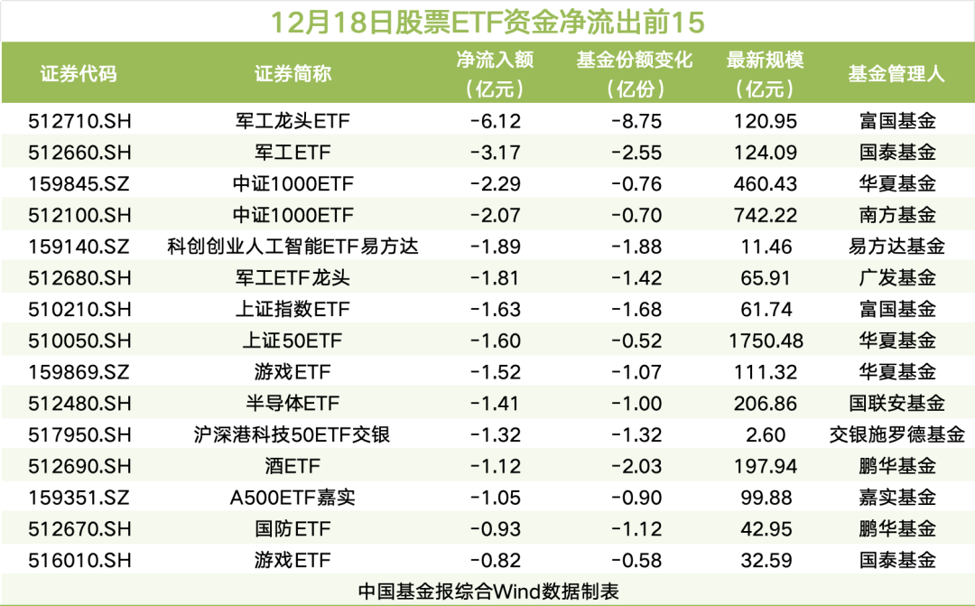12月18日,軍工、游戲等行業(yè)主題ETF資金凈流出較多。其中,軍工龍頭ETF資金凈流出6.12億元。